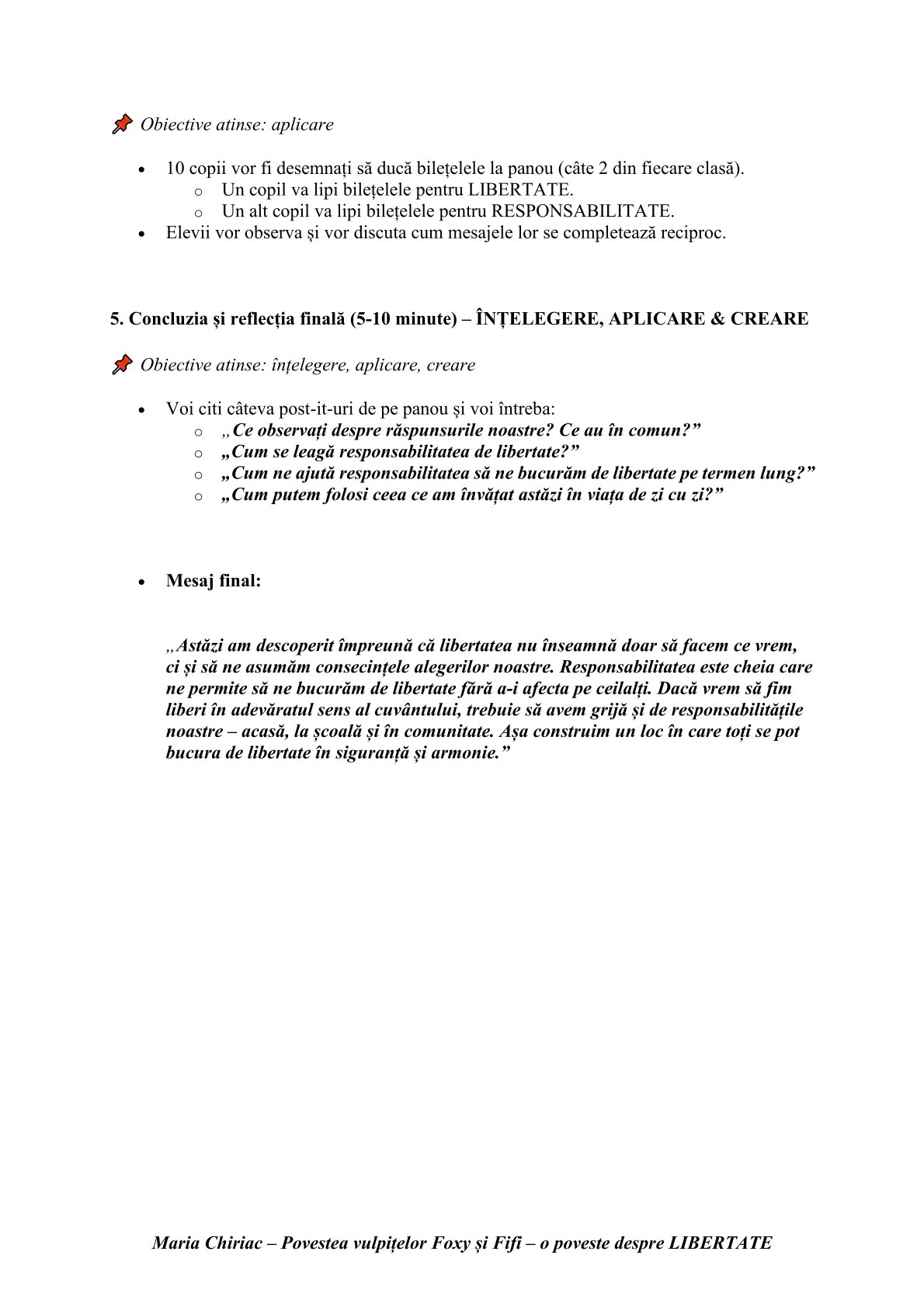 activitatea „Pe tărâmul libertății” , inspirată din „Povestea vulpițelor Foxy și Fifi”